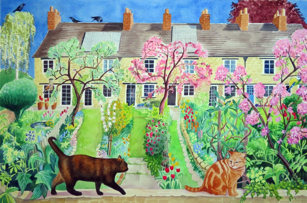 This beautiful painting ‘Spring Garden Patrol, Eynsham’ is by my talented and lovely friend, Jane Tomlinson. (Click to go to her gallery) It shows her two cats inspecting the gardens in the relaxed way that I hope to emulate, and it also includes an old apple tree.