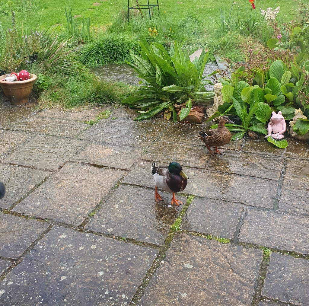 This is part of my garden. Can you see the hail coming down? The garden ducks are not impressed!