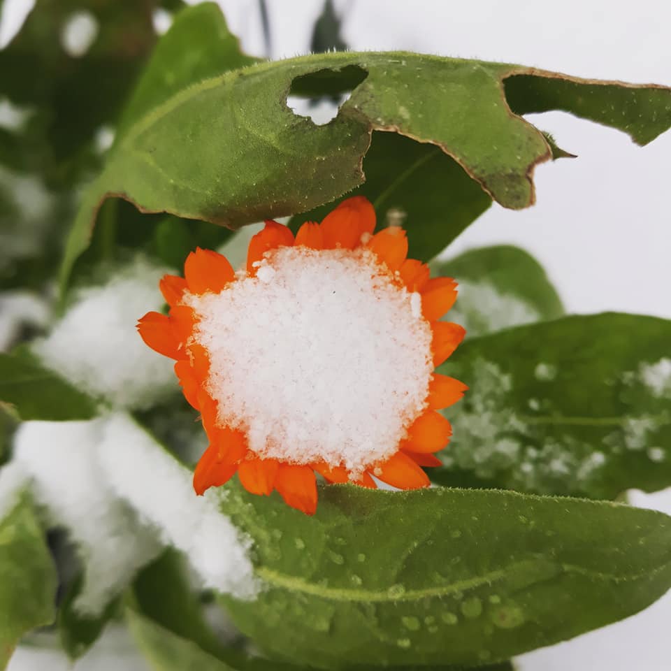 This was taken on my phone, on 8th February 2021. A marigold that has come up from a seed scattered on the bed last summer. In flower in winter, and now full of snow. The leaf is obviously keeping some little insect fed.